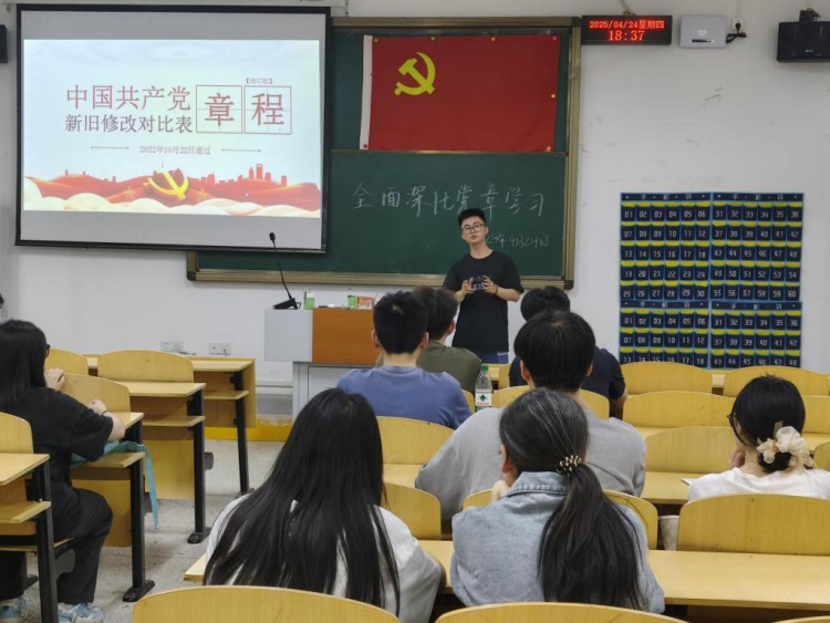 当晚,6776永利集团学生党支部书记方腾带来“全面深化党章学习”的专题。他把党章内容通过一幅幅历史长卷——南湖红船、遵义会议、两弹一星等让学员们感受那一条条条文背后凝聚的先辈意志。屏幕上,党章中的“十六字方针”与烽火硝烟交相辉映,年轻学子仿佛穿越时空,与历史对话。
