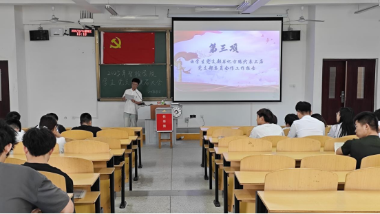 学生党支部书记方腾同志代表上一届支部委员会作工作报告。过去一年,支部聚焦组织建设、党员培养、思想引领与志愿服务等方面,全面推动党建与学院发展深度融合,荣获“先进基层党组织”称号。支部通过规范党员发展流程、丰富学习载体、打造服务品牌,不断提升组织力、影响力和凝聚力,取得了阶段性成果。