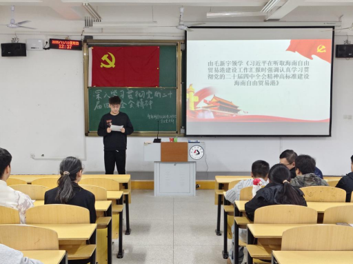 随后,学生党支部书记方腾率先登台,带领全体人员深入学习《中国共产党第二十届中央委员会第四次全体会议公报》与《中共中央关于制定国民经济和社会发展第十五个五年规划的建议》,系统解读全会提出的核心要义和实践要求,结合“十五五”时期“加快高水平科技自立自强”“建设现代化产业体系”等战略部署,深入阐释规划蓝图中与学院专业发展、青年成长紧密相关的内容;紧接着,毛新宇领学《习近平在听取海南自由贸易港建设工作汇报时强调认真学习贯彻党的二十届四中全会精神高标准建设海南自由贸易港》,以区域发展实践为鲜活案例,生动诠释了全会精神在具体工作中的落地路径与实践成效;王明秀则聚焦《习近平推动落实全球发展倡议、全国安全倡议、全国文明倡议、全国治理倡议》,引导全体人员深刻领会新时代中国特色大国外交理念与国家治理体系现代化的核心内涵,拓宽了理论学习的视野格局。