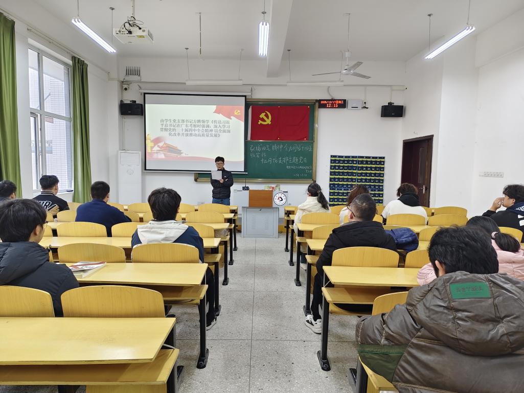 活动伊始,方腾带领全体参会人员深入学习习近平总书记在广东考察时的重要论述,系统解读党的二十届四中全会以高质量发展为主题的核心要义,强调高质量发展是质的有效提升和量的合理增长的有机统一,是全面建设社会主义现代化国家的首要任务。随后,围绕习近平总书记对全面依法治国工作的重要指示,他着重阐释法治“固根本、稳预期、利长远”的保障作用,号召青年党员将法治思维融入专业学习与科研实践,恪守规则底线,筑牢行事根基。
