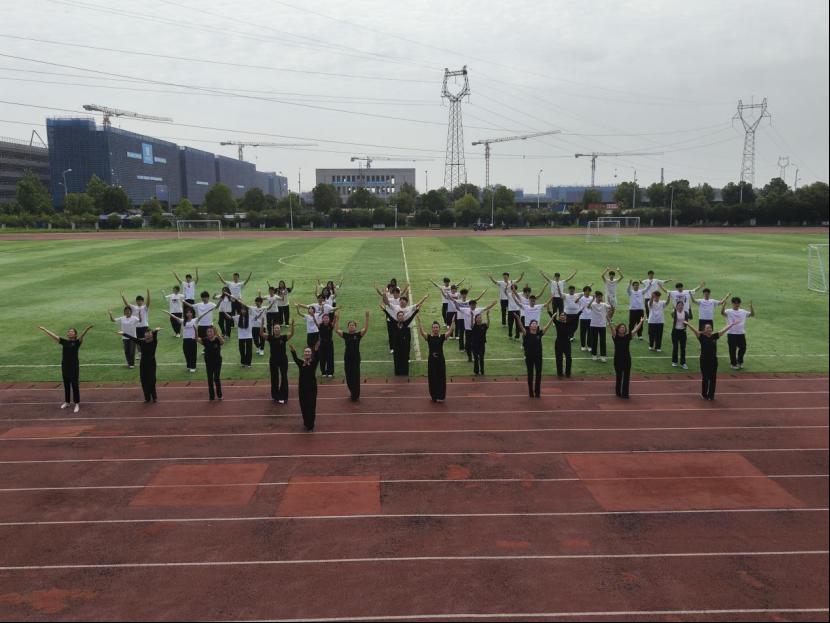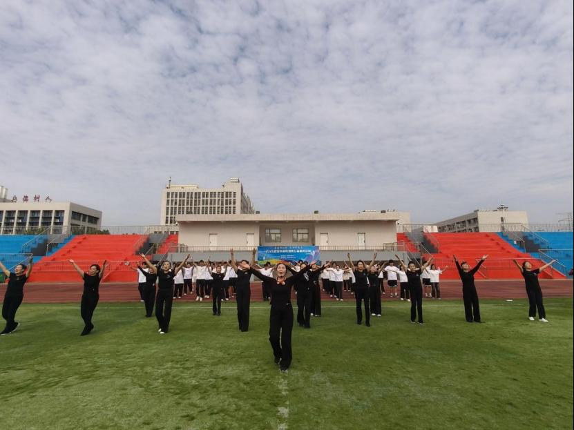 周杰老师及其团队站在队伍最前排亲身示范。伴随动感的节拍,示范人员开始了舞蹈教学。周老师专注细致,及时纠正学生的动作,确保团队节奏统一。在舞蹈高潮部分,她以标准的舞姿为学生树立榜样,通过微笑与眼神传递鼓励,学生们深受感染,全情投入,展现出最佳状态。学生与教学人员的互动充满温暖与活力,共同营造了积极向上的学习氛围。