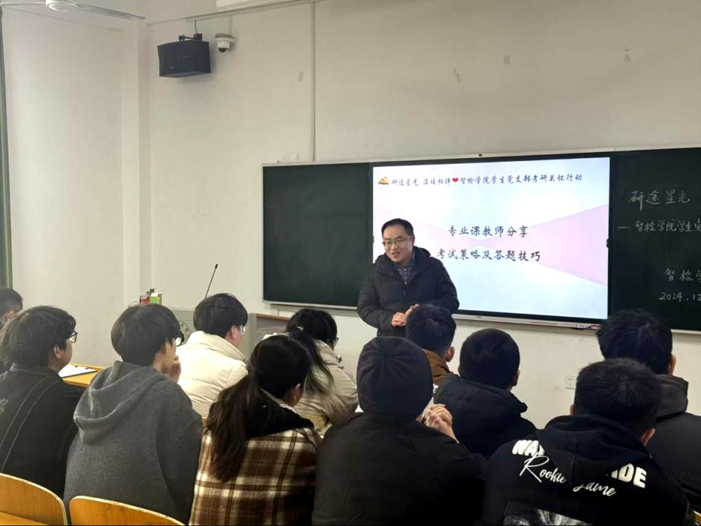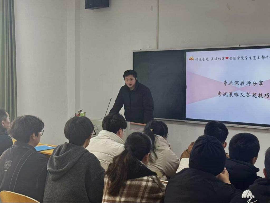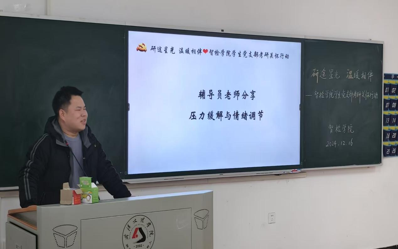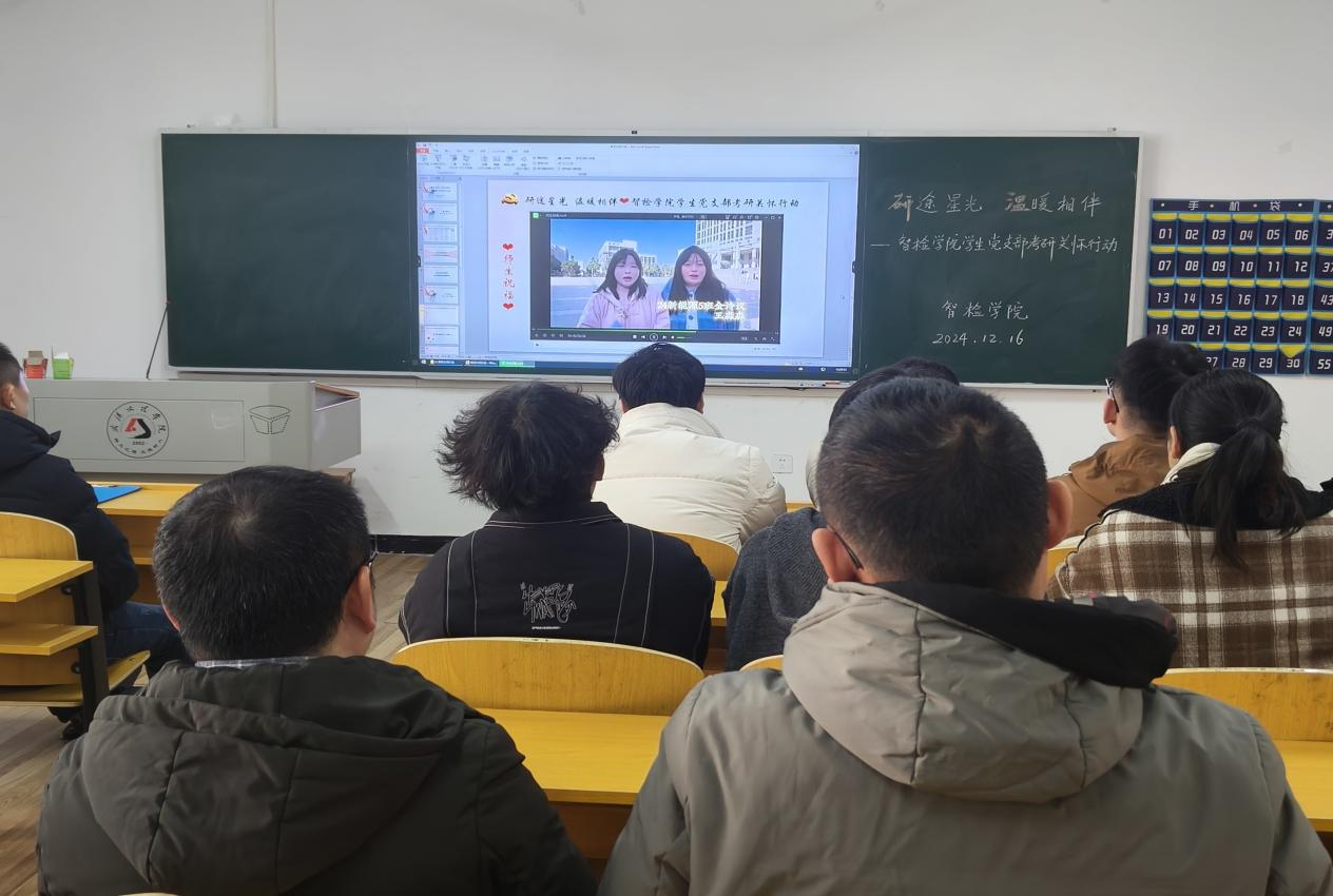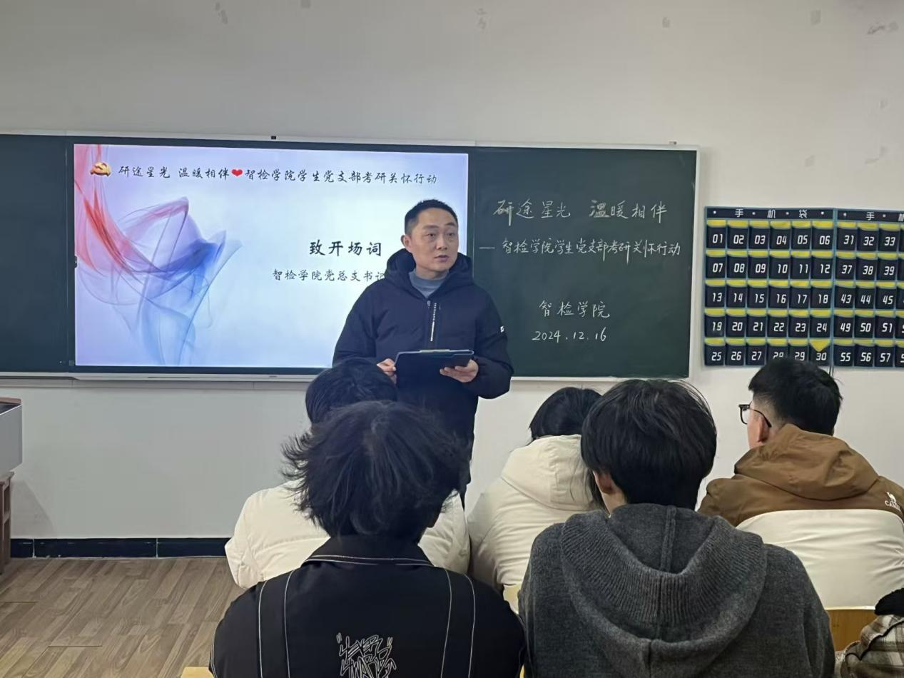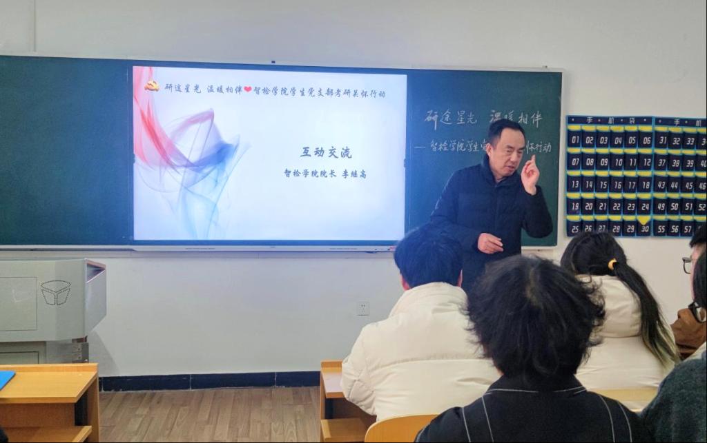 为了多维度、深层次的对考研学子进行关怀与支持,帮助他们在考试中更加坚定与从容。12月16日,在冬日的暖阳下,智检学院“研途星光,温暖相伴”考研关怀活动在5栋119教室温情启幕,旨为即将踏上2024年研究生考试征途的学子们注入强大的精神动力。本次活动由智检学院学生党支部精心策划,院长李继高、党总支书记韩玮携众位师生齐聚一堂,共同为考研学子搭建起一座知识与情感的桥梁。