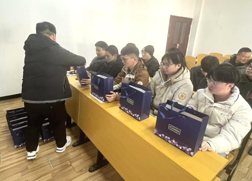 如一股暖流,滋润了学子干涸的心田。最后,孙丰代表学院为考研学子送上了精心准备的小礼物——寓意着“考研顺利”的文具套装、保暖袜、牛奶以及考研加油明信片和桌面励志小立牌等。这份礼物虽不贵重,却承载着学院对学子们的深情厚意与美丽愿景。收到礼物的学子们,脸上洋溢着幸福的笑容,眼中闪烁着对未来的憧憬与决心。