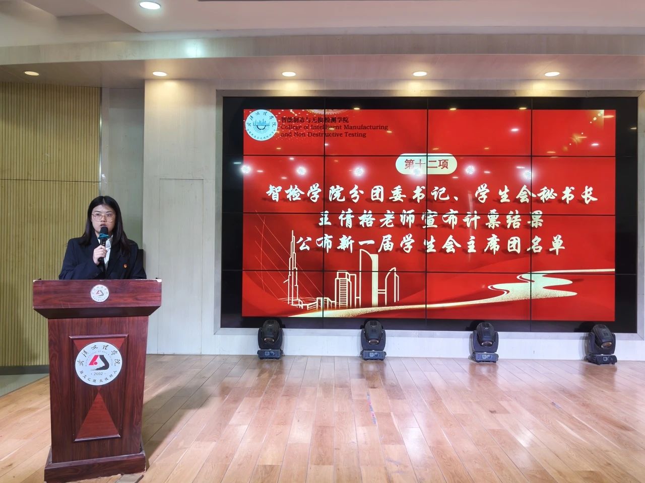 经过公正、公平的投票程序,新一届学生会主席团成员顺利产生。在全场代表的注视下,智检学院分团委书记,学生会秘书长王倩格郑重宣布了第二届学生会委员会主席团的选举结果。此时,会场内响起了阵阵掌声,大家对新当选的主席团成员表示热烈祝贺。