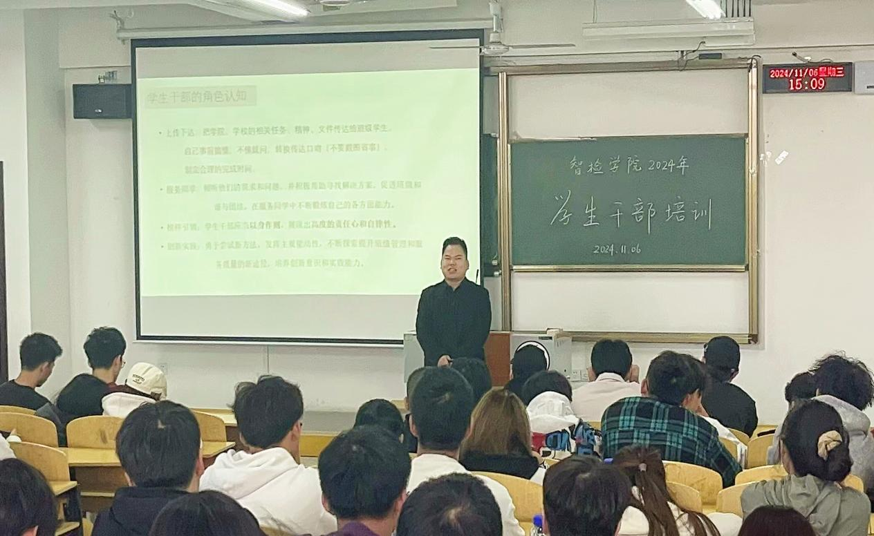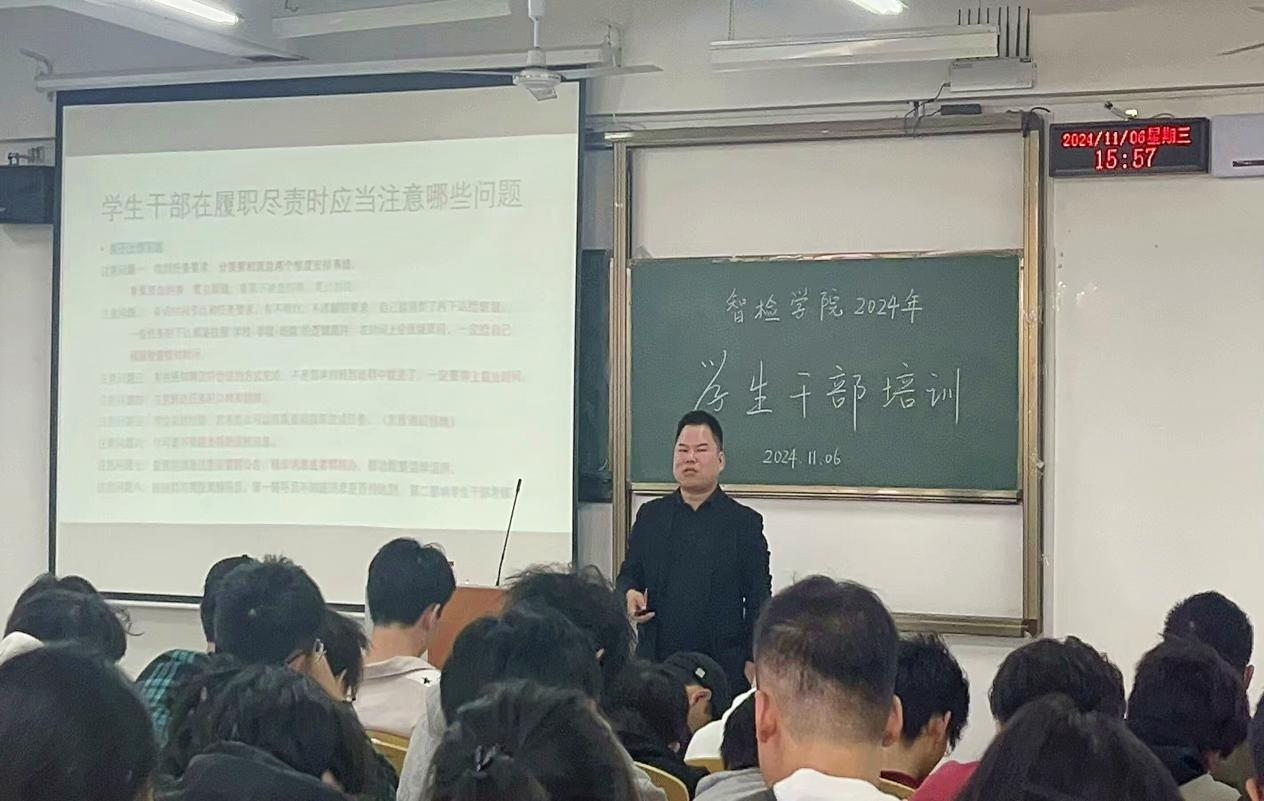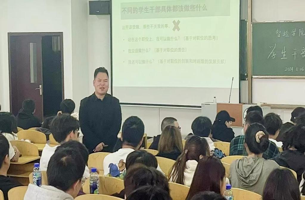 为全面提升2024级行政班级学生干部的角色认知、责任感与实践能力。11月6日,智检学院在5栋225教室成功举办了一场意义非凡的学生干部培训活动。此次培训由我院辅导员孙丰主讲,2024级全体学生干部齐聚一堂,共同参与了这场关于学习、管理、生活的思想交流。