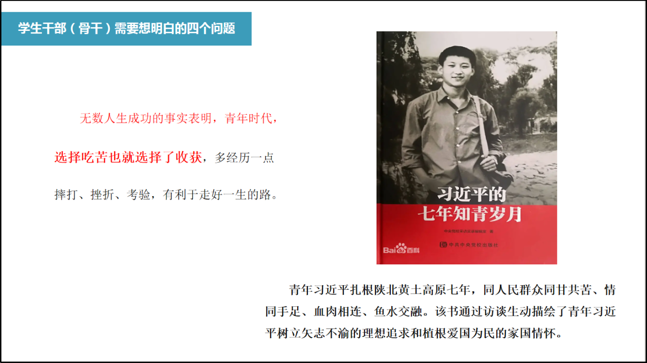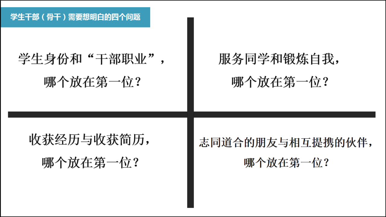 孙丰还结合实际案例,引导学生干部围绕“学生身份与干部职位哪个放在第一位?服务同学与锻炼自我哪个放在第一位?收获经历与收获简历哪个放在第一位?志同道合的朋友和相互提携的伙伴哪个更重要?”四个核心问题进行了充分讨论,这四个问题触及了学生干部在学习、生活、成长过程中的根本性问题,引发了现场学生沉浸式的深思。