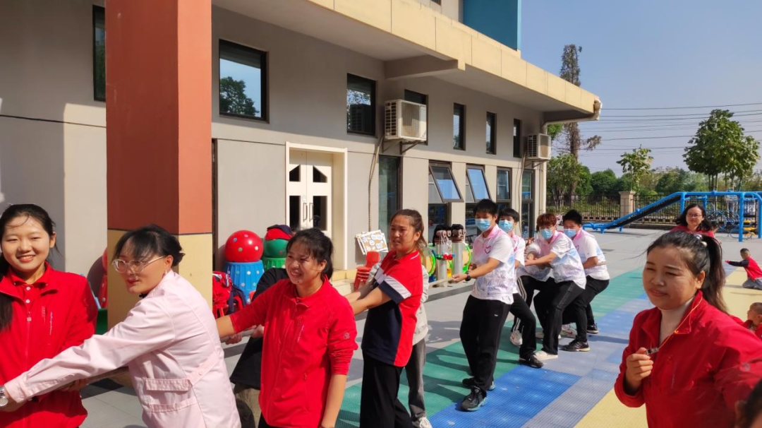 毛毛虫接力赛,队员们化身为“守护者”,带领孩子们穿梭在园区内,现场飘散出温馨而浓厚的和谐氛围。孩子们在志愿者的帮助下,不仅锻炼了身体,还培养了团队协作和解决问题的能力。在拔河互动环节中,志愿者和幼师们一起参与其中,孩子们在旁边加油助威,释放着他们的活力与激情,欢呼声此起彼伏,形成了一幅生动活泼的美丽画面。