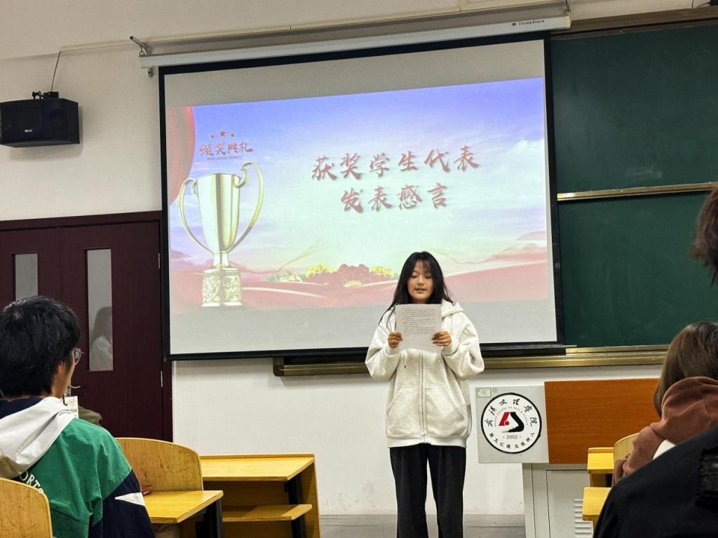 接着,获奖学生代表吕紫嫣上台发表了感言。她说到,这次比赛不仅让她有机会表现自己的特长,更让她深刻体会到只要努力就一定会有收获的真理,同时通过镜头也让她学会了捕捉生活的美好瞬间。吕紫嫣感谢学院提供的平台,让她能够与同学们一起交流学习,共同成长。