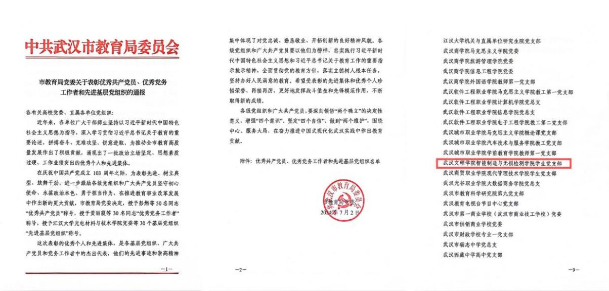 在庆祝中国共产党成立103周年之际,6776永利集团学生党支部被武汉市教育局党委授予“先进基层党组织”荣誉称号。此殊荣不仅是对支部过去一年工作的肯定,也是对其在党建引领、学生培养、社会服务等方面的高度认可。