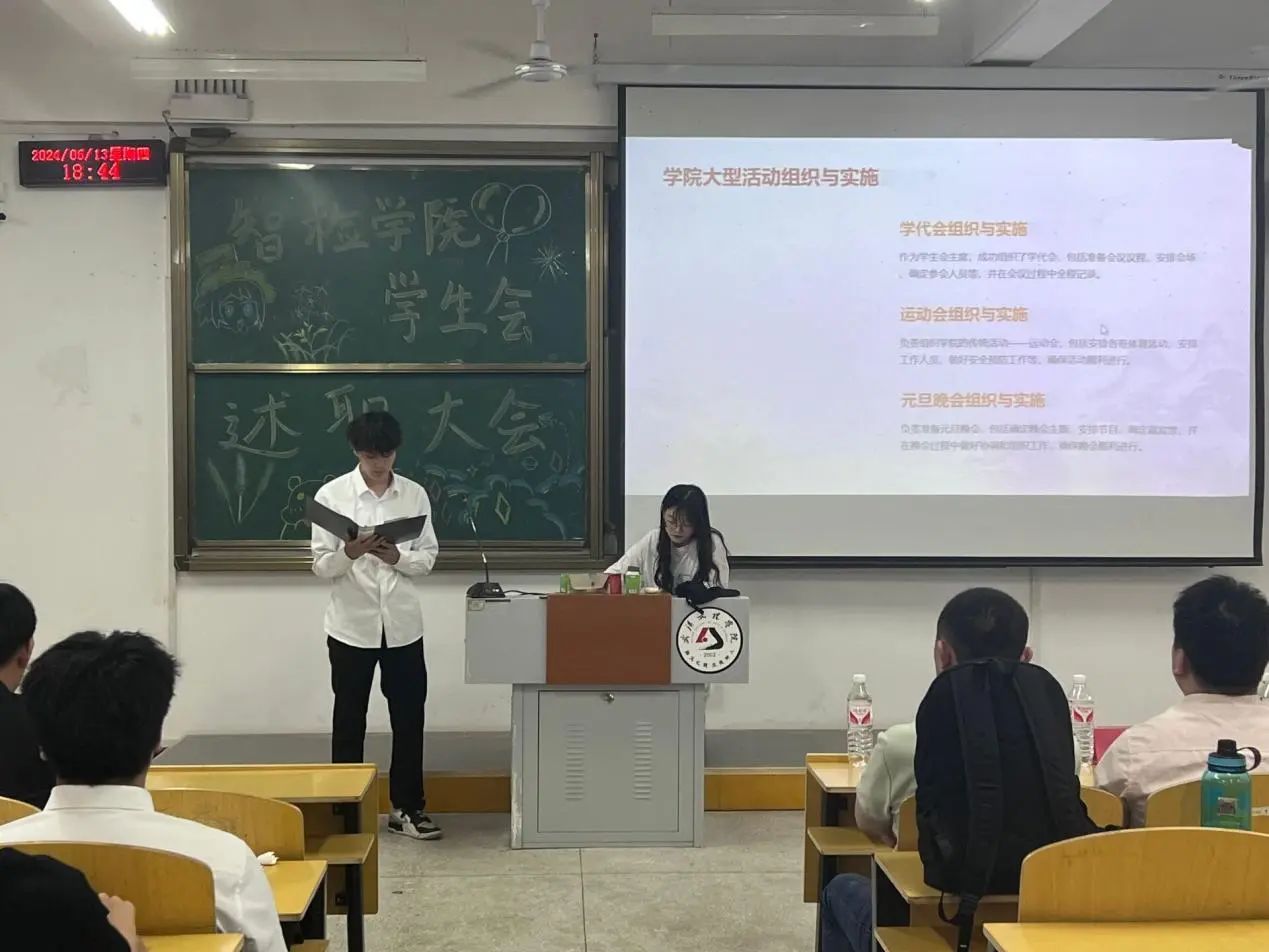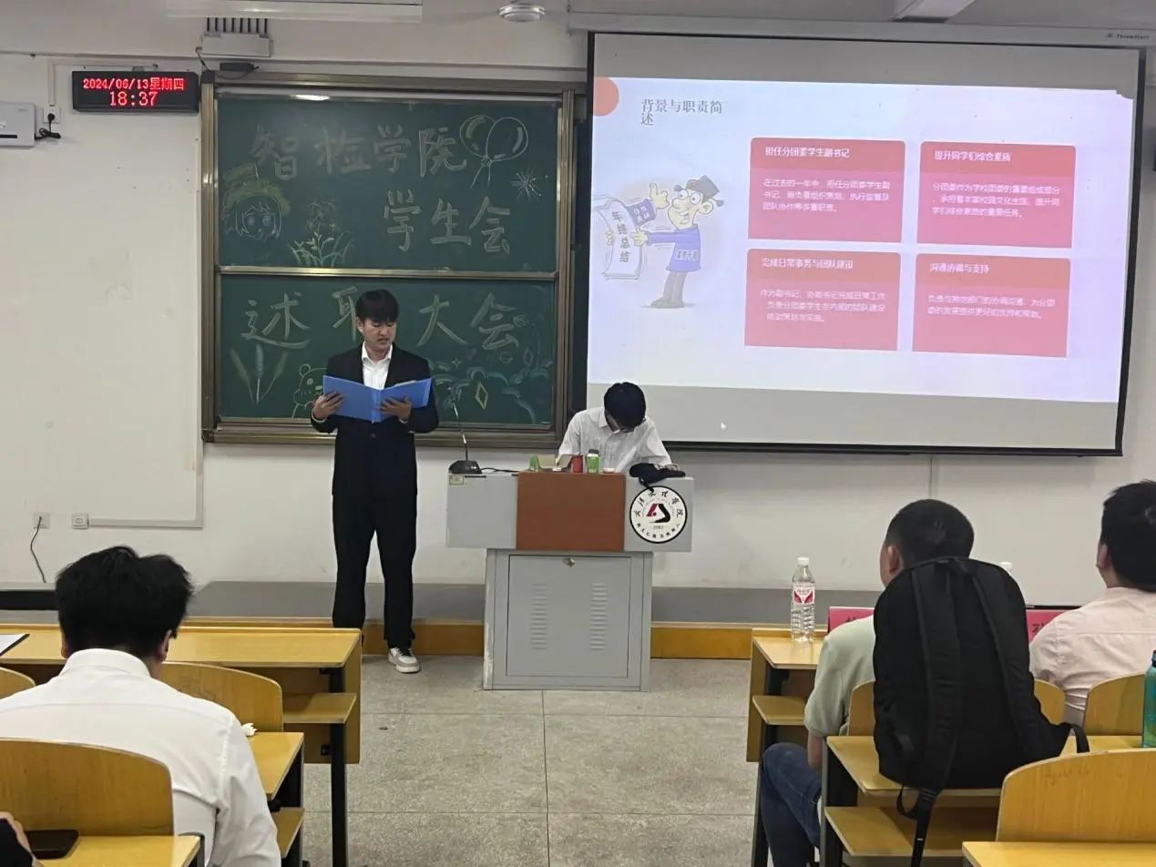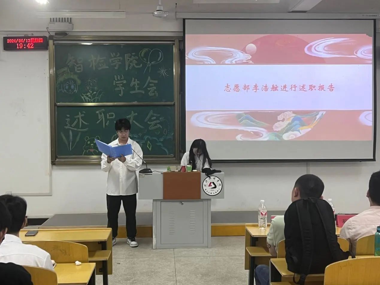 会议伊始,韩玮发言。他讲到,今天我们在此举行智检学院学生会述职大会,这是对学生会工作成果的一次重要检验,也是推动学生会不断进步的重要契机,学生会作为联系学校和学生的桥梁和纽带,肩负着重要的责任和使命。此外,他在肯定成绩的同时也指出了不足和问题,要求同学们下一步要发奋图强,举一反三,查漏补缺,希望各位团学干部能以高度的责任心和荣誉感,认真履行职责,为学院发展和学生成长贡献全部力量。