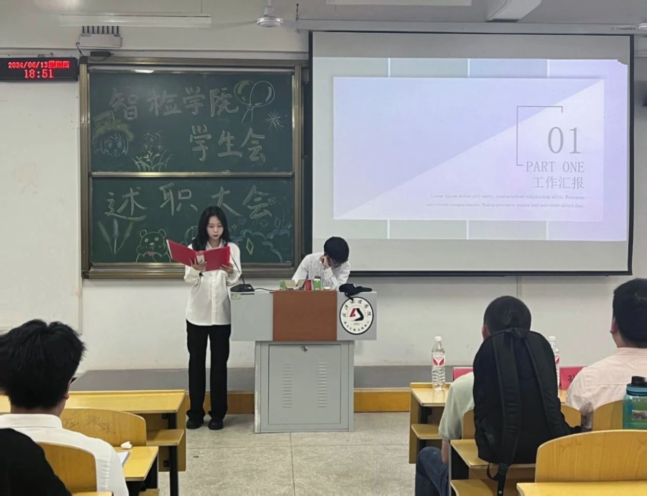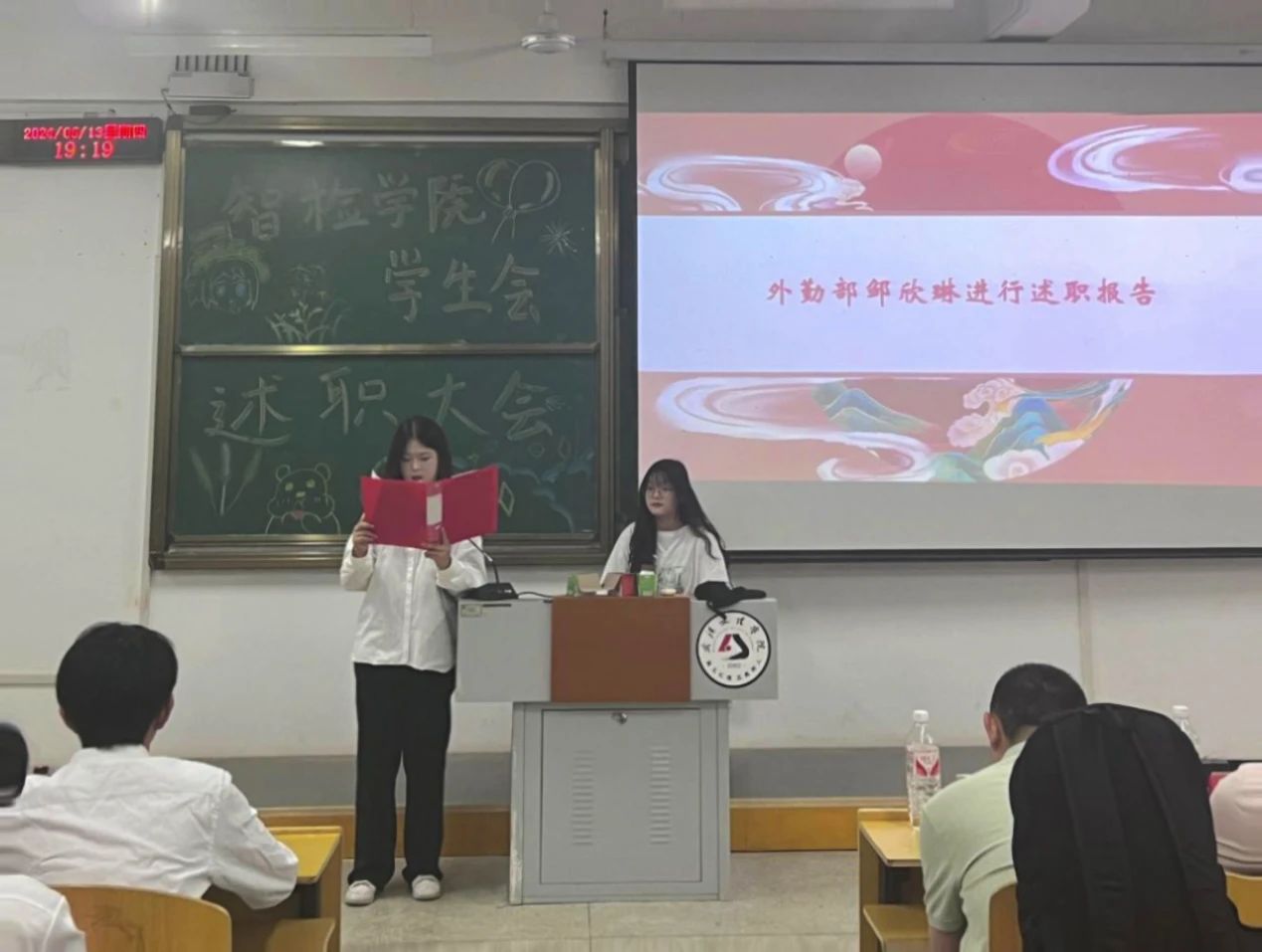 回顾往昔,为提高学生会干部自身的工作水准,总结经验与不足,确保智检学院学生会工作的进一步提升。6月14日,我院在5-124教室隆重举办了第一届分团委学生会述职大会。学院党总支书记韩玮,分团委书记韩文霞,辅导员王茜、尚上卜、孙丰出席了本次会议。