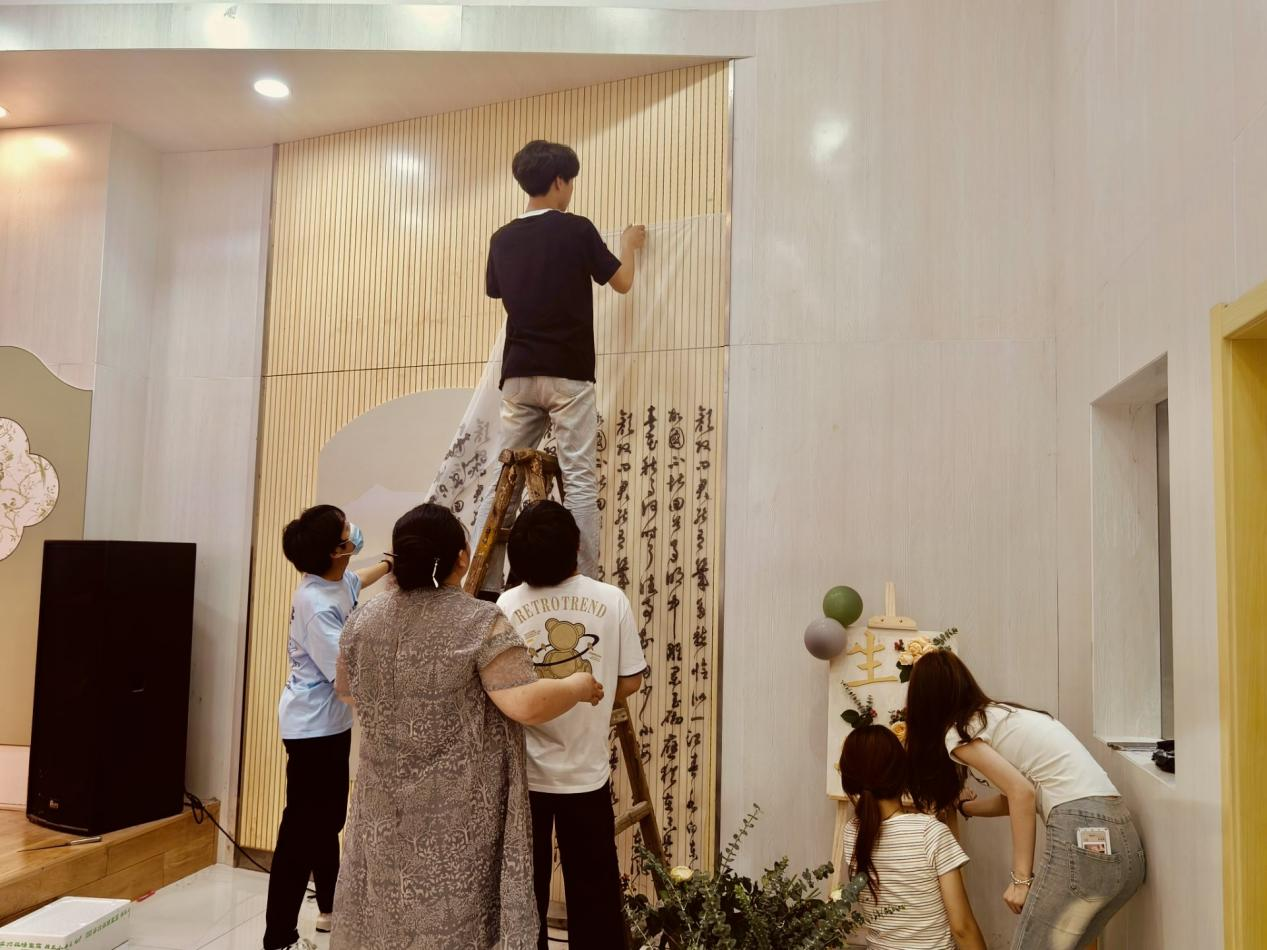 同学们早早来到现场,全部加入布置活动的会场中,大家忙的不亦乐乎。有的打气球、有的挂背景、有的摆物品、还有的拉彩灯,只为给今天到场参加集体生日会的老师们一份惊喜和满意。