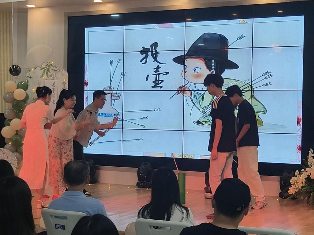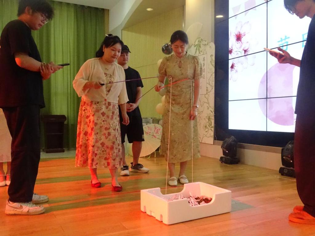 下一环节,投壶和鱼竿钓粽子巧妙地将传统游戏元素与现代娱乐形式相结合,教师们个个跃跃欲试。投壶游戏中,各位教师展现了精准的投掷技巧;而在鱼竿钓粽子游戏中,大家则体验了别样的垂钓乐趣。游戏现场欢声笑语不断,气氛和谐而融洽。