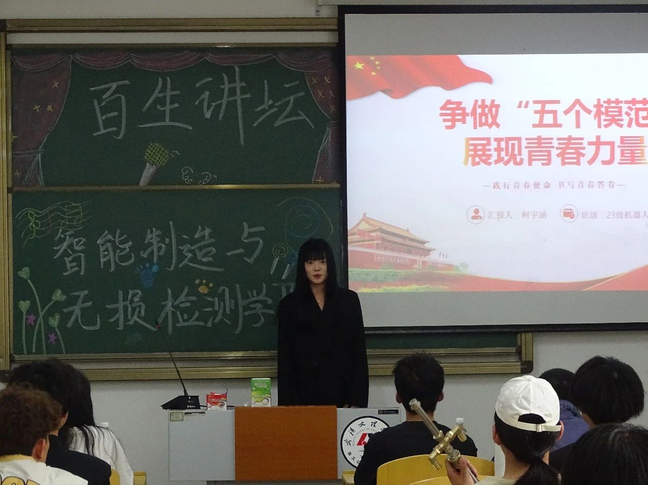 为了进一步推进落实习近平新时代中国特色社会主义思想,坚定不移深化党史学习教育,创造“百生学,百生讲”的良好学习氛围,巩固党的二十大教育成果,5月8日,智检学院在5号教学楼105教室举行了“百生讲坛”优秀主讲人院赛。经过自愿报名,支部推荐,共有7名选手进入到院赛环节。本次比赛特邀请了学院党总支书记韩玮、学生党支部书记方腾及分团委书记韩文霞担任评委,学生会主席团及各年级学生代表踊跃参与视听。