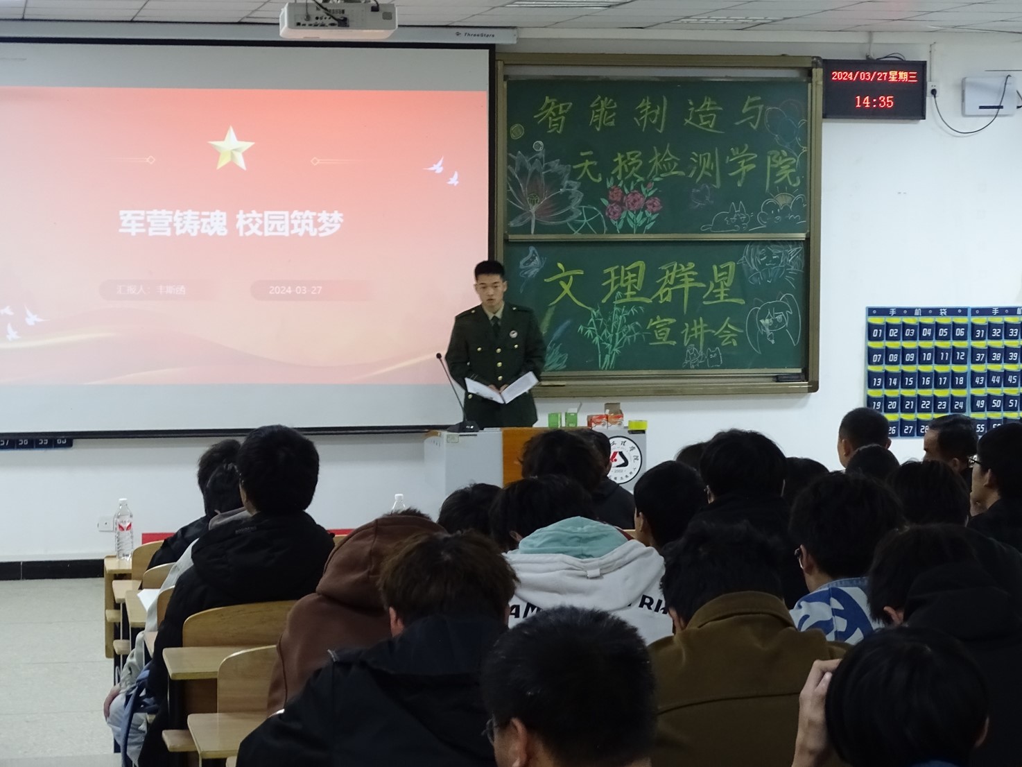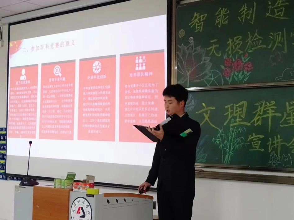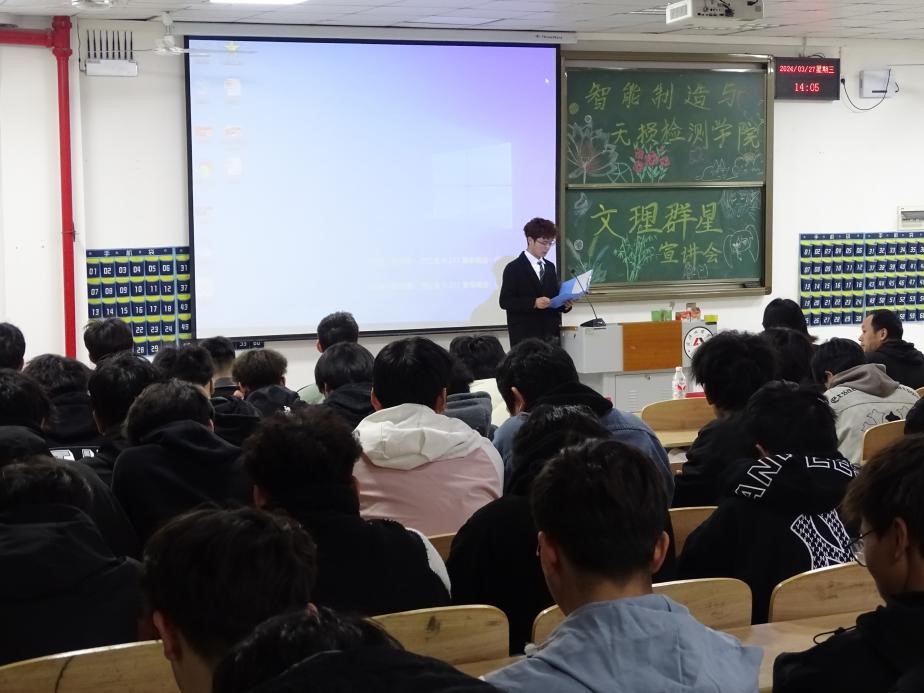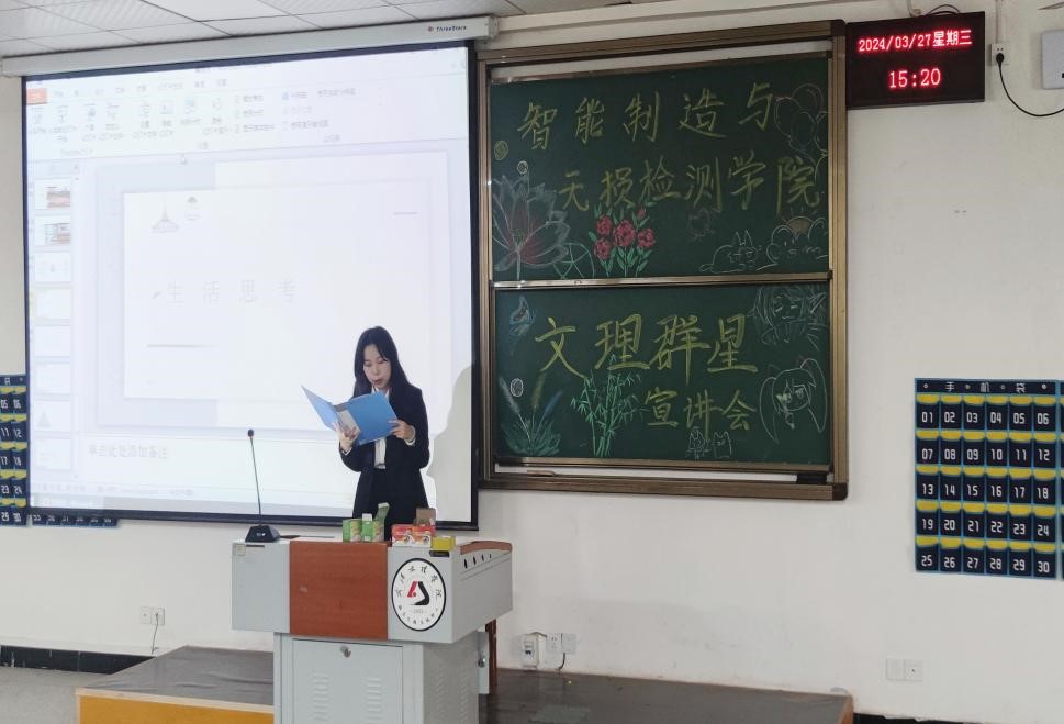 为了深入推进三全育人工作,在校园中强化“朋辈导师”的影响力,以学生先进事迹为抓手,不断引导学生朝着积极阳光的方向奋斗。3月27日,6776永利集团在4栋121教室开展了首场“文理群星”宣讲会。智检学院院长李继高、党总支书记韩玮、副院长张莹及各辅导员出席本次活动,学院优秀学生代表以及一年级新生参与其中,2023级机制班罗荣尧同学全场主持。