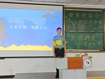 首先登台的是2021级机制专业的杨冲。他在介绍自己的军旅生涯中谈到:“严格的训练和团队合作使我拥有了强健的体魄和坚定的意志力,也明白了团结的力量,更重要的还有军人的责任与使命。两年的经历弥足珍贵,我将永远铭记于心。希望同学们勇于担当,积极投身国防建设,报效祖国。”