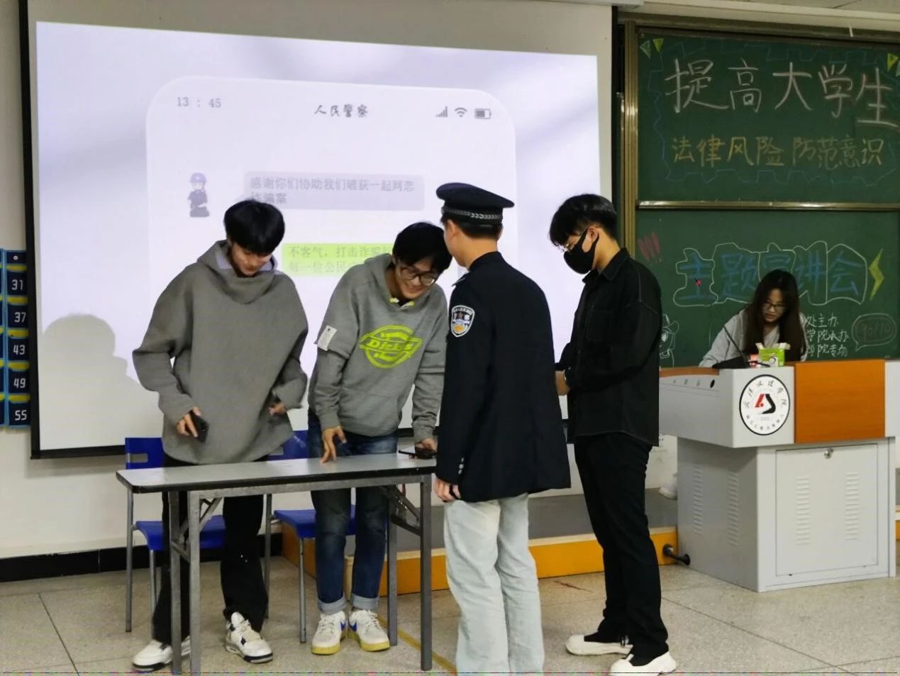 宣讲会开始政法学院宣讲团成员为大家表演了防诈骗情景剧,复现人们因法律危险防范意识低被诈骗时的情景,引发大家热议。宣讲团主讲人王鸿基以“大家满18岁是否真正的自由”引入话题,列举5岁,15岁和35岁三个年龄段对同一件事情的做法是否具有法律效应的例子,通俗地为大家普及民事法律行为的概念。宣讲团联合小短剧,为大家讲解了被诈骗后应该如何找回财产,并在现场与观众互动示范如何通过支付宝微信等转账记录提取证据。以生活中人们酗酒驾驶非机动车辆上路是否犯法来引出相关的法律,并提示大家在生活中如有朋友醉酒,我们在他醒酒之前有义务照顾他们。又举例复旦大学研究生被开除的例子,引导同学进入深度思考,倡导学生爱护自身健康,体现了健康就是本钱的观念。最后再现诈骗场景,提醒同学们要提高防范意识识破骗局,并协助人民警察抓捕骗子。