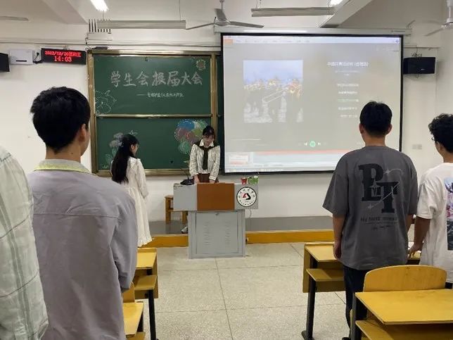会议第一项全体起立唱中国共青团团歌。随后分团委书记韩文霞老师进行讲话,韩老师阐述了过去的一年在上一届学生会干部的带领下学院取得的优异成绩,也指出了目前在学生会管理上出现的一些问题,并提出了对新一届学生会干部的要求:有责任心、有良好的形象、有高效率。