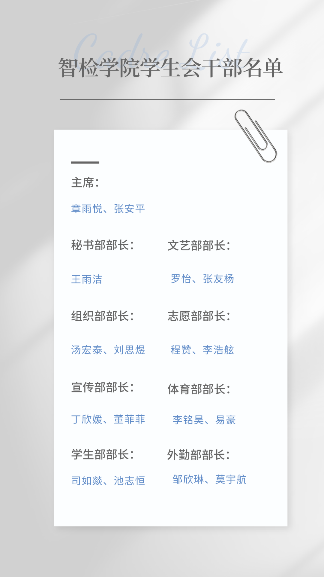 为了保障学生会工作的连续性,培养出一批有责任感、效率高、形象好的学生会干部。本着“公平、公正、公开”的原则,智检学院于9月20日在5栋125教室进行了新一届学生会换届大会,学院党总支书记陈静、分团委书记韩文霞、23级新生辅导员方腾老师、尚上卜老师出席本次大会。
