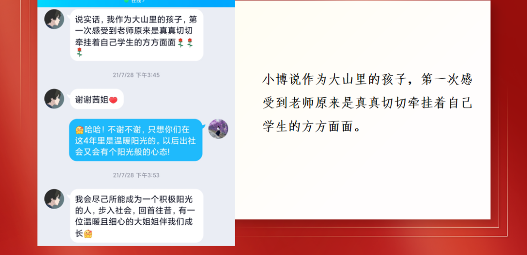 王茜老师在工作中用心聆听学生的感受,善于从学生自身出发,激励学生,促进学生自我调适。时刻关心学生,去引导,去支持,做学生的精神引路人。