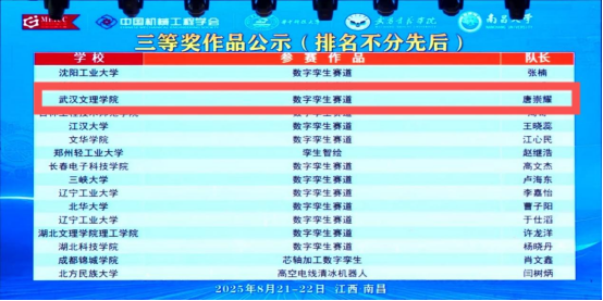 8月21日至22日,由中国机械工程学会主办的2025年中国大学生机械工程创新创意大赛机械产品数字化设计赛全国总决赛在南昌圆满落幕。我院学子历经区域赛、国赛预赛层层筛选,最终在全国总决赛中脱颖而出,成功斩获全国一等奖1项、三等奖1项,尽显文理学子的专业实力与创新风采。