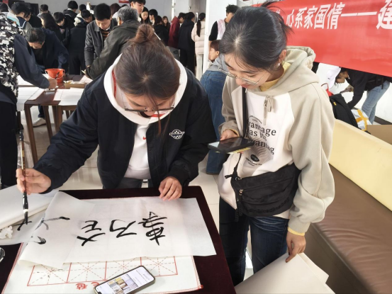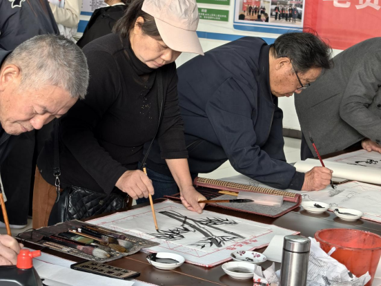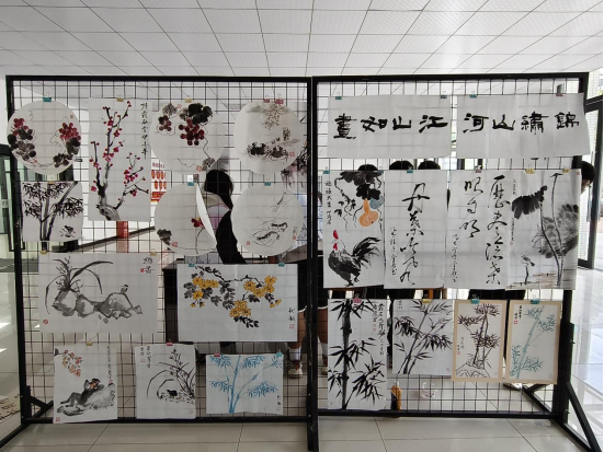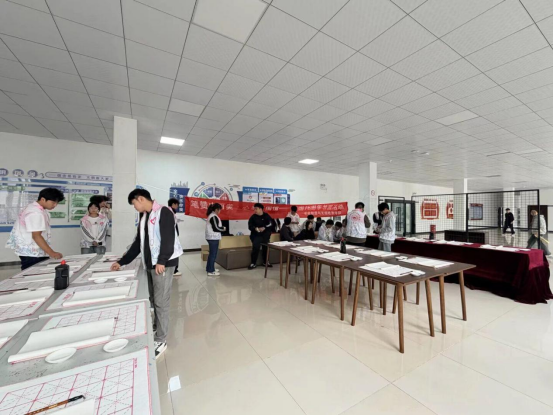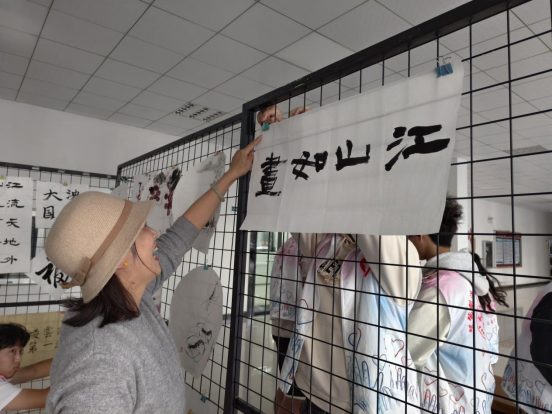 银发挥毫,尽显岁月沉淀的底蕴。老年大学的书画爱好者们凝神静气,落笔间力透纸背:“锦绣山河”四字遒劲挺拔,尽显山河壮阔;“江山如画”水墨氤氲,勾勒诗意意境。每一笔顿挫、每一划转折,都藏着半生的文化积累与人生智慧。他们还现场示范创作,细致讲解中锋运笔的稳健、侧锋勾勒的灵动,娓娓道来留白艺术中的东方美学,让在场学子深受启发。