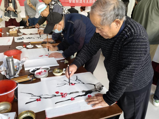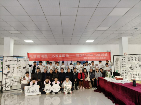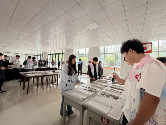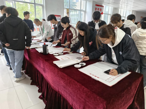 素宣铺展间尽显雅致,墨香萦绕中饱含深情。学生会团队提前精心布置场地,笔墨纸砚一一齐备,细致周到的安排让活动现场满溢温馨文艺气息。活动特邀武湖老年大学书画爱好者与学院师生欢聚一堂,众人以笔为椽、以墨为情,借书画艺术传递对祖国的无限热爱与美好祈愿。