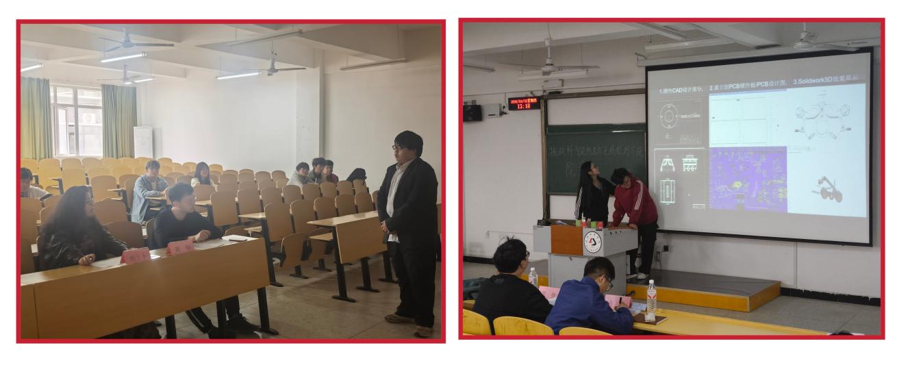 先进制造赛道在5-322与5-323教室率先掀起热潮,15个项目同台竞技。这里,是智慧与汗水的碰撞场。每个项目背后,都是团队成员无数个日夜的拼搏。从灵感的火花闪现,到反复调研、实验的艰难探索,再到项目最终成型,每一步都凝聚着对创新的执着。答辩时,选手们自信从容,逻辑清晰地阐述创新点与应用前景,用专业与坚定展现新时代青年的挑战精神。团队成员默契配合,让创意完美呈现,使挑战化作成长阶梯。