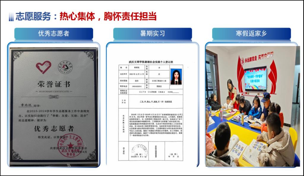 2024年2月,她参加了返家乡“寒假学堂”社会实践活动,缓解少年儿童寒假看护难、托管难等问题。同年7月,她参与了暑假实习,到广东南海国际建筑设计公司,与资深的工程造价师一起工作,协助参与了多个项目的实际操作和数据分析。