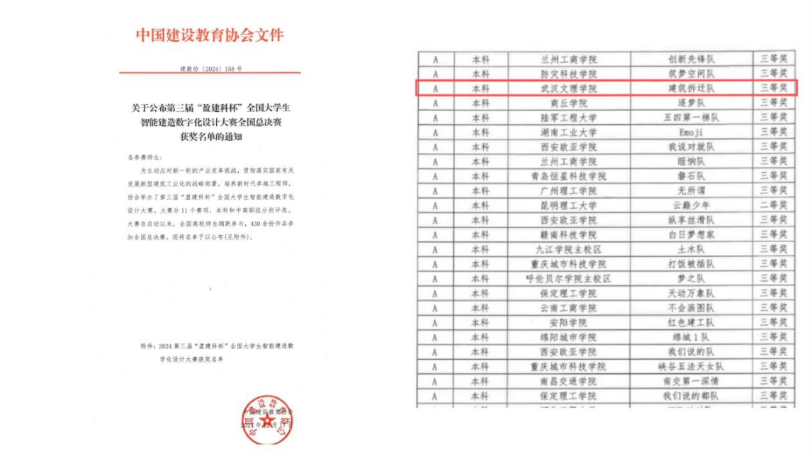 近日,由中国建设教育协会主办的2024第三届“盈建科杯”全国大学生智能建造数字化设计大赛全国总决赛落下帷幕。来自华中科技大学,陆军工程大学,湖南工业大学,yl6776永利集团等426所院校,千余支队伍,近7600余人同台竞技。6776永利集团派遣一支代表队参赛,经过层层角逐,由鄢张扬与陈国珍老师指导的“建筑拆迁队”在此赛事A类赛项中斩获全国总决赛三等奖。